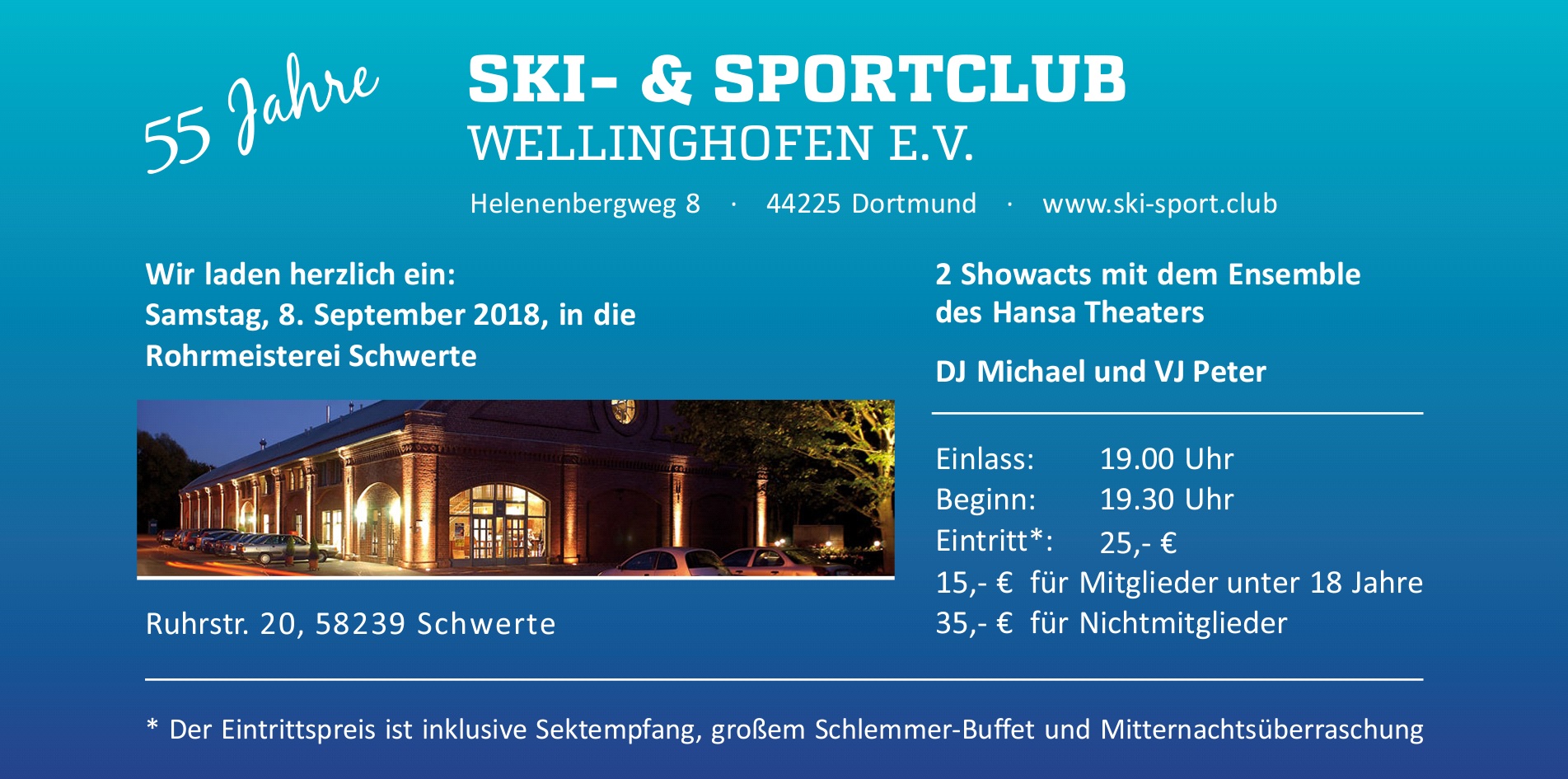 wie Ihr mit Sicherheit in den Medien mitbekommen habt, hat es im Hansa-Theater in Dortmund Hörde gebrannt und die Location ist auf unbestimmte Zeit nicht nutzbar. Davon ist leider auch unsere Jubiläumsfeier betroffen. Wir haben lange überlegt, wie wir mit der Situation umgehen und haben nun entschieden, dass wir das 55-jährige Bestehen des Ski- und Sportclub Wellinghofen am Samstag, den 8. September in der Rohrmeisterei in Schwerte feiern. Da sich bis jetzt nur Mitglieder anmelden konnten, könnt Ihr jetzt auch Werbung im Freundes- und Bekanntenkreis machen. Alle sind herzlich willkommen! Anmeldungen nimmt unsere 1. Vorsitzende Heike Kausch entgegen. Der Eintritt kostet 30 €, für Mitglieder unter 18 Jahren 20 € und für Nichtmitglieder 40 €.