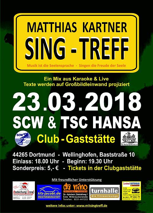 Der „Sing-Treff“ hat eine Spiellänge von 2 x 45 Minuten plus Nachspielzeit. Für den Ski- und Sportclub Wellinghofen, bei dem er seit über 25 Jahre Mitglied ist und dem TSC Hansa wird er seine Premierenveranstaltung geben. Das Event findet am Freitag, den 23.03.2018 in der Club-Gaststätte des TSC Hansa in Wellinghofen, Baststraße 10 statt. Einlass ist 18 Uhr, Beginn um 19.30 Uhr. Premieren-Sonderpreis: 5,00 €. Tickets (begrenzt) erhältlich in der TSC Hansa Club-Gaststätte.